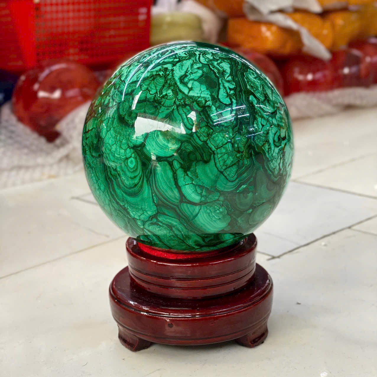 Bi cầu đá ngọc khổng tước, còn được gọi là bi cầu Malachite, là một loại đá quý phong thủy có màu xanh tự nhiên với những dải màu đồng tâm đẹp mắt. Đây là một vật phẩm phong thủy được ưa chuộng nhờ vào các công dụng và ý nghĩa sau: